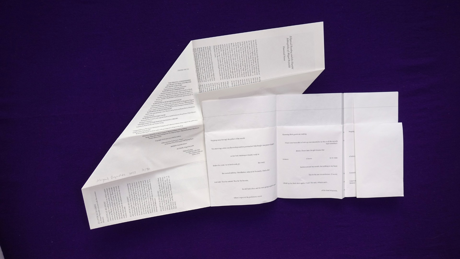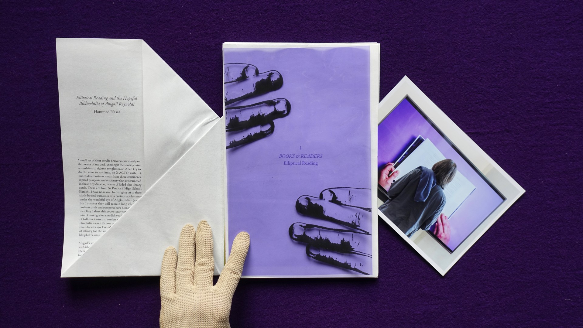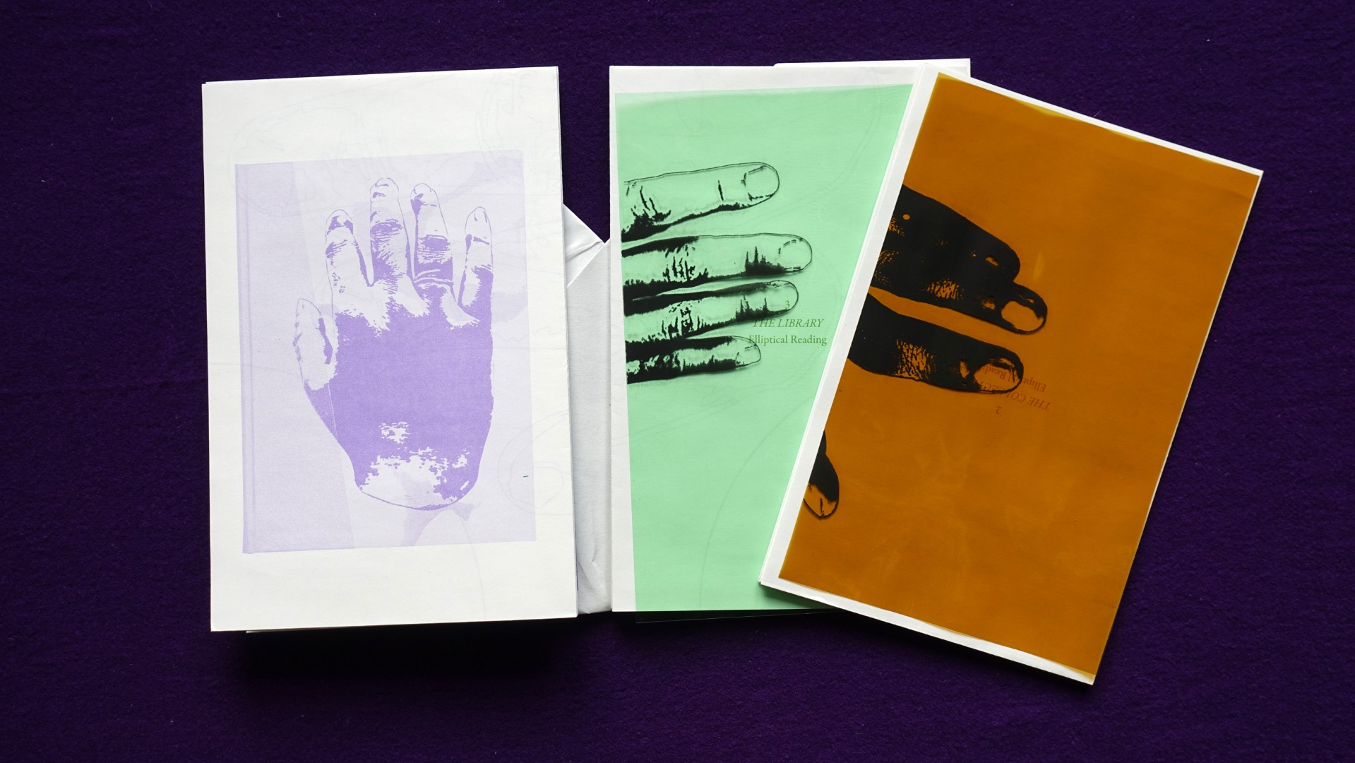 Ce livre documente la lecture elliptique, une œuvre créée pour le British Art Show 9, présentée dans quatre bibliothèques du Royaume-Uni en 2021-2022. Le projet active les bibliothèques en organisant une heure de lecture régulière où les participants partagent des extraits de leurs livres préférés, créant ainsi un collage de mots collectif et évolutif. Les livres utilisés ont été relus par l’artiste; chaque couverture est gravée à la main du lecteur, célébrant à la fois la forme du livre et le choix individuel. La lecture elliptique explore l’importance de lire à haute voix, de partager des livres personnels et dont nos identités sont façonnées par nos choix. Le projet préconise les bibliothèques en tant qu’espaces publics vitaux et non commerciaux au Royaume-Uni. Ce livre d’accompagnement reflète la performance en assemblant des textes pliés qui forment un cercle lorsqu’ils sont complètement dépliés, mettant l’accent sur l’engagement tactile avec le livre. Il comprend un texte décrivant le projet, trois livrets au format affiche, des impressions en C de l’œuvre, des acétates des mains des lecteurs et une transcription d’une lecture à la Manchester Poetry Library, imprimée sur du papier biblique et disposée à l’aide d’un « engineer’s fold ». Le livre met en évidence la bibliothèque comme un espace dynamique et évolutif pour l’expression personnelle et collective.